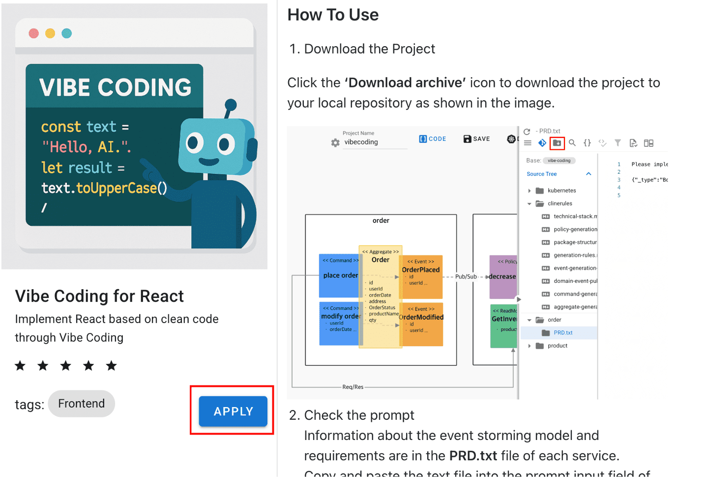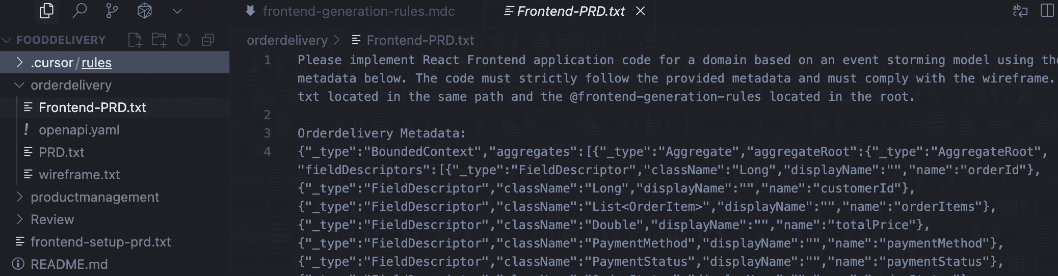 Cursor AI 기반 바이브코딩을 진행할 때, Prompt역할을 하며, 동시에 이벤트스토밍 모델 기반 생성된 데이터인 데타데이터를 제공합니다. 이를 통해 이벤트스토밍 모델에 따른 구현이 진행됩니다.