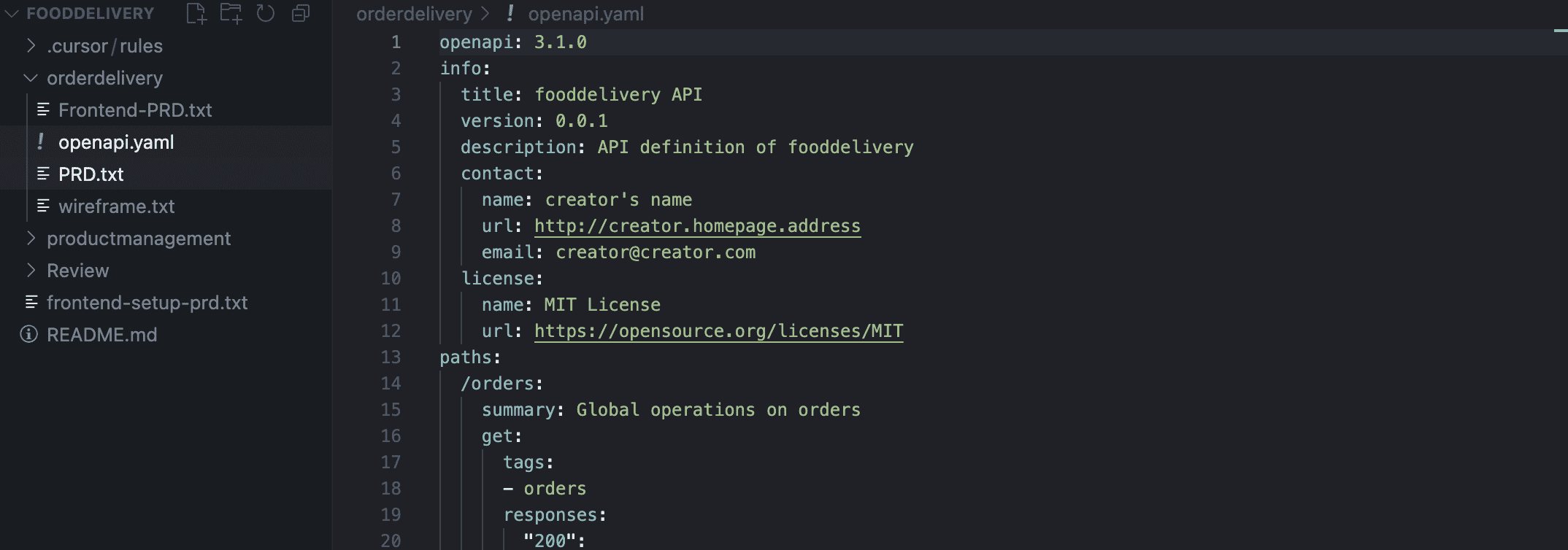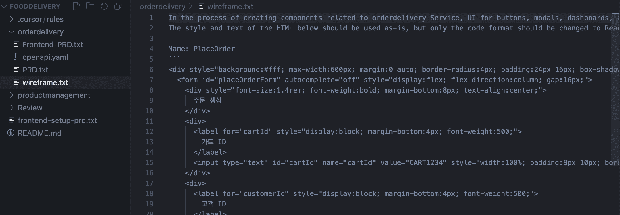 'Ctrl + L'을 입력하여 우측에 Cursor LLM 영역을 활성화합니다. 이후 단계에서 해당 Prompt영역에 템플릿/토핑 적용을 통해 생성된 PRD를 Prompt에 추가하여 바이브코딩을 진행할 수 있으며 생성된 Rule과 PRD에 작성된 음식배달 시나리오 모델의 정보를 추출한 Metadata를 통해 요구사항에 맞는 코드 구현이 진행됩니다.