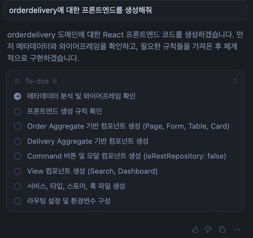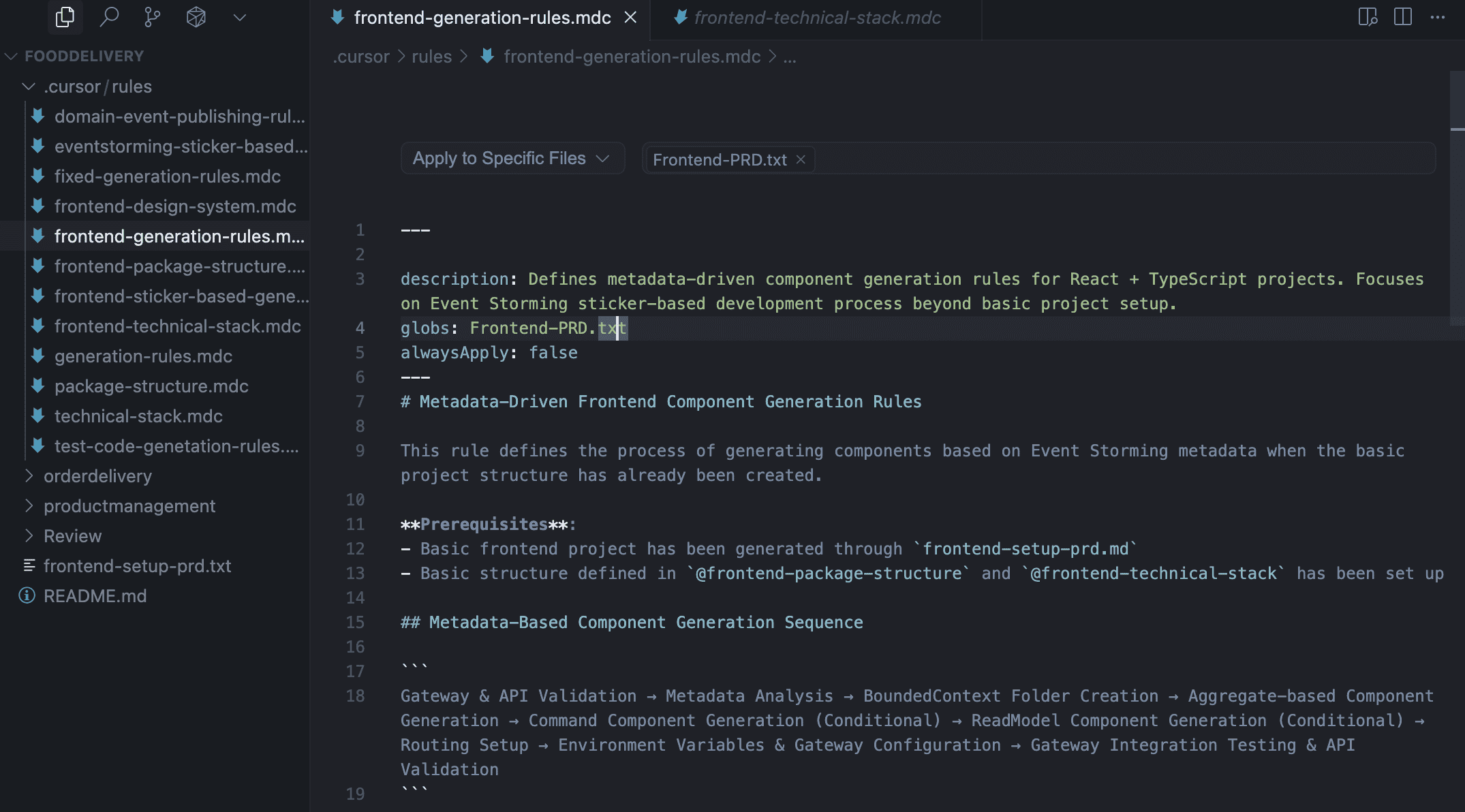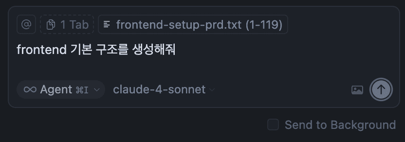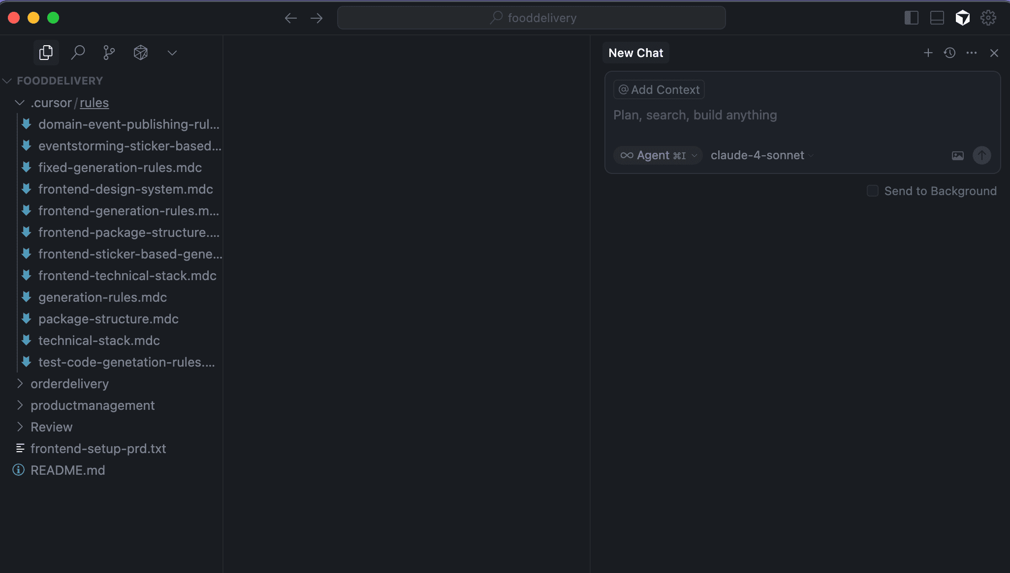 frontend-setup.txt를 통해 기본 구조가 생성되었다면 BoundedContext 하위에 생성된 FrontendPRD.txt에 작성된 내용을 새로운 Cursor AI Prompt창을 활성화하여 동일한 방법으로 바이브코딩을 진행하면 이전에 설명한 Rule 기반 프론트엔드 구현이 시작되는 것을 확인할 수 있습니다.