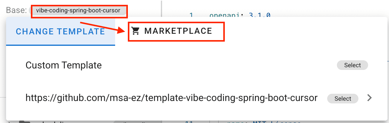 이때, TEMPLATES 탭에 위치한 'Vibe Template for Spring Boot'를 적용하면 백엔드와 프론트엔드에 대한 바이브코딩을 진행할 수 있습니다.