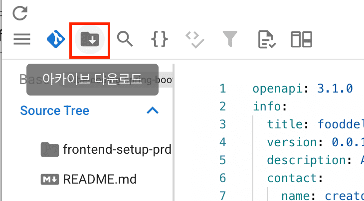 적용이 완료되면, 상단 메뉴 중 '아카이브 다운로드'를 클릭하여 적용된 프로젝트를 다운받을 수 있습니다.