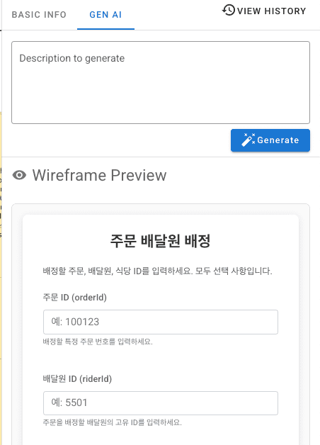 생성된 UI 스티커를 더블 클릭 하여 패널을 생성한 후, 'GEN AI' 탭을 클릭하면 연결된 Command 스티커의 정보를 기반으로 와이어프레임이 생성된 것을 확인할 수 있습니다.