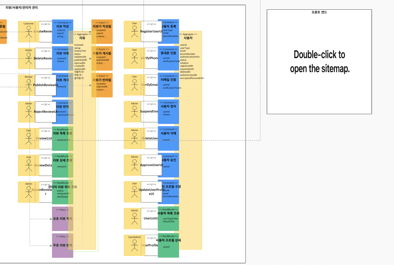 또한, 하단의 '프론트엔드' BoundedContext가 생성된 것을 확인할 수 있는데, 이는 이전 단계에서 생성한 사이트맵을 확인할 수 있습니다.